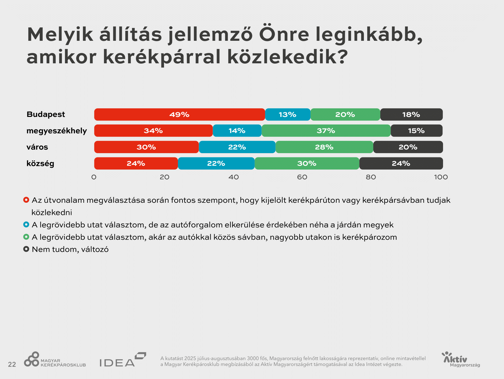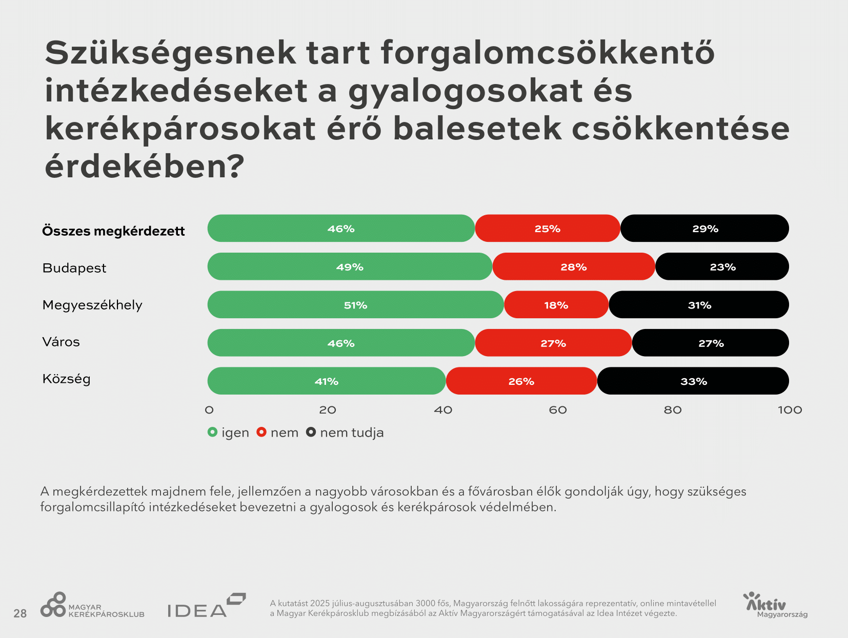 A megkérdezettek majdnem fele, jellemzően a nagyobb városokban és a fővárosban élők gondolják úgy, hogy szükséges forgalomcsillapító intézkedéseket bevezetni a gyalogosok és kerékpárosok védelmében.