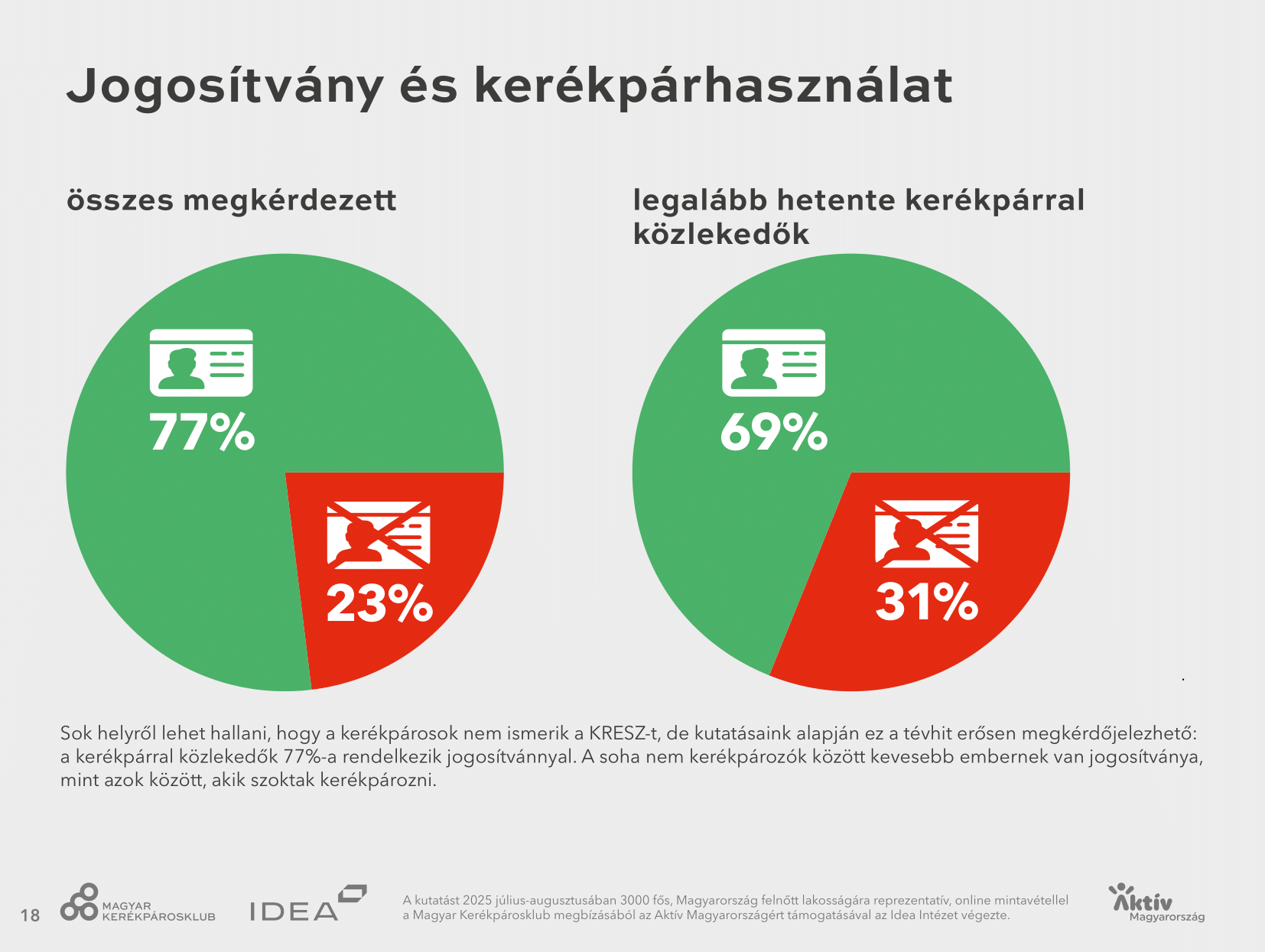 Sok helyről lehet hallani, hogy a kerékpárosok nem ismerik a KRESZ-t, de kutatásaink alapján ez a tévhit erősen megkérdőjelezhető: a kerékpárral közlekedők 77%-a rendelkezik jogosítvánnyal. A soha nem kerékpározók között kevesebb embernek van jogosítványa, mint azok között, akik szoktak kerékpározni