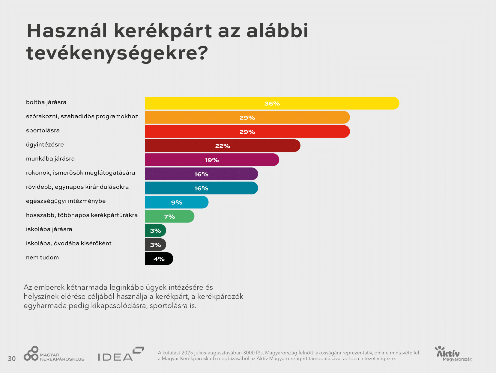 Az emberek kétharmada leginkább ügyek intézésére és helyszínek elérése céljából használja a kerékpárt, a kerékpározók egyharmada pedig kikapcsolódásra, sportolásra is.