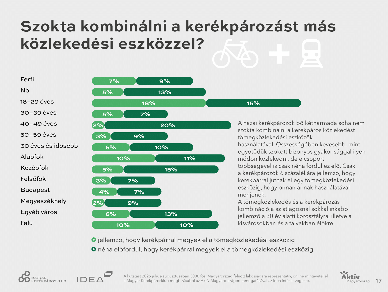 A hazai kerékpározók bő kétharmada soha nem szokta kombinálni a kerékpáros közlekedést tömegközlekedési eszközök használatával. Összességében kevesebb, mint egyötödük szokott bizonyos gyakorisággal ilyen módon közlekedni, de e csoport többségével is csak néha fordul ez elő. Csak a kerékpározók 6 százalékára jellemző, hogy kerékpárral jutnak el egy tömegközlekedési eszközig, hogy onnan annak használatával menjenek. A tömegközlekedés és a kerékpározás kombinációja az átlagosnál sokkal inkább jellemző a 30 év alatti korosztályra, illetve a kisvárosokban és a falvakban élőkre.