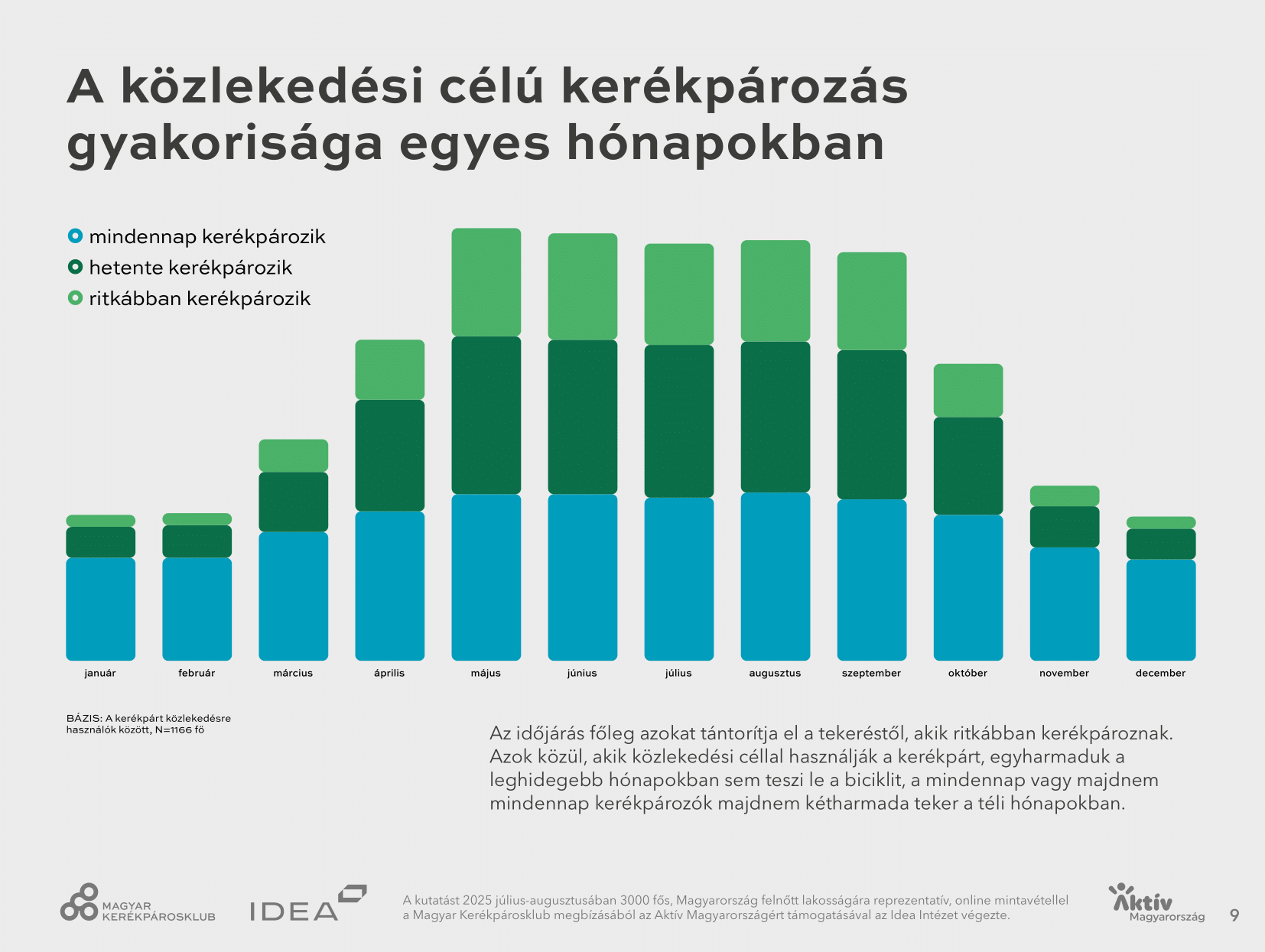 Az időjárás főleg azokat tántorítja el a tekeréstől, akik ritkábban kerékpároznak. Azok közül, akik közlekedési céllal használják a kerékpárt, egyharmaduk a leghidegebb hónapokban sem teszi le a biciklit, a mindennap vagy majdnem mindennap kerékpározók majdnem kétharmada teker a téli hónapokban.