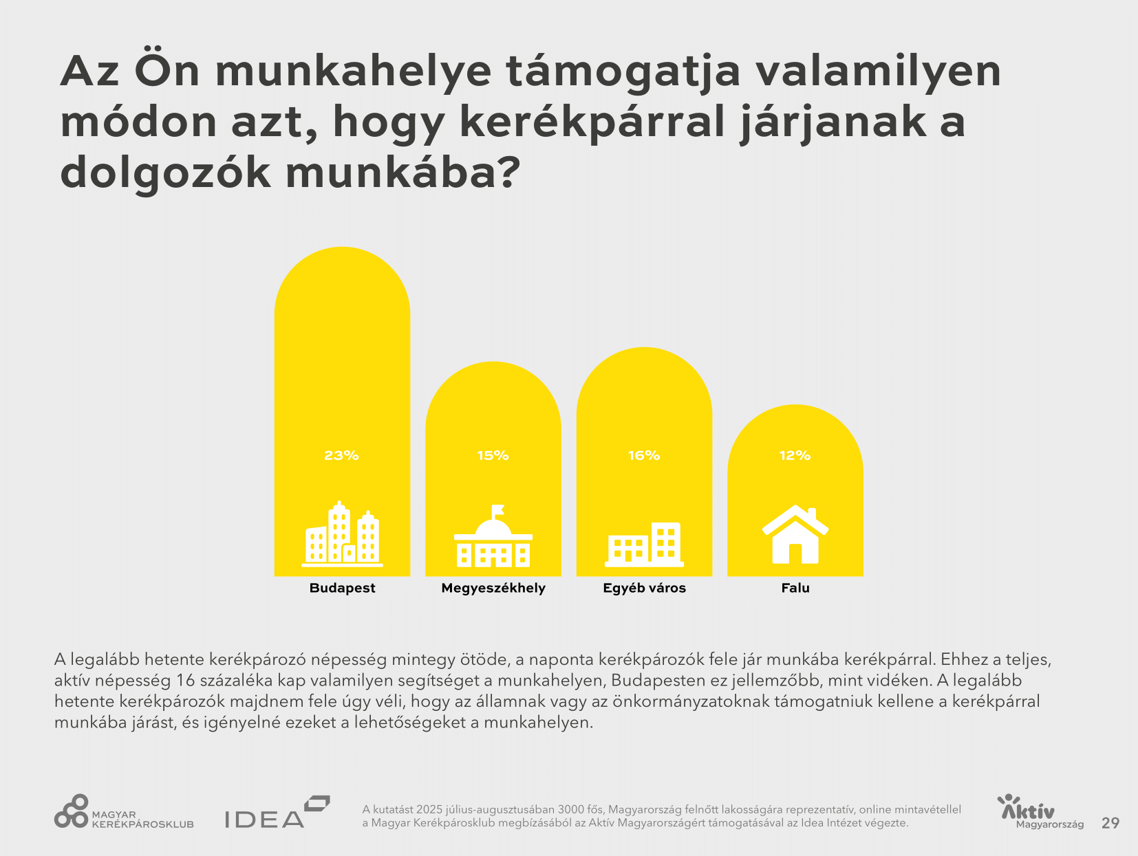 A legalább hetente kerékpározó népesség mintegy ötöde, a naponta kerékpározók fele jár munkába kerékpárral. Ehhez a teljes, aktív népesség 16 százaléka kap valamilyen segítséget a munkahelyen, Budapesten ez jellemzőbb, mint vidéken. A legalább hetente kerékpározók majdnem fele úgy véli, hogy az államnak vagy az önkormányzatoknak támogatniuk kellene a kerékpárral munkába járást, és igényelné ezeket a lehetőségeket a munkahelyen.