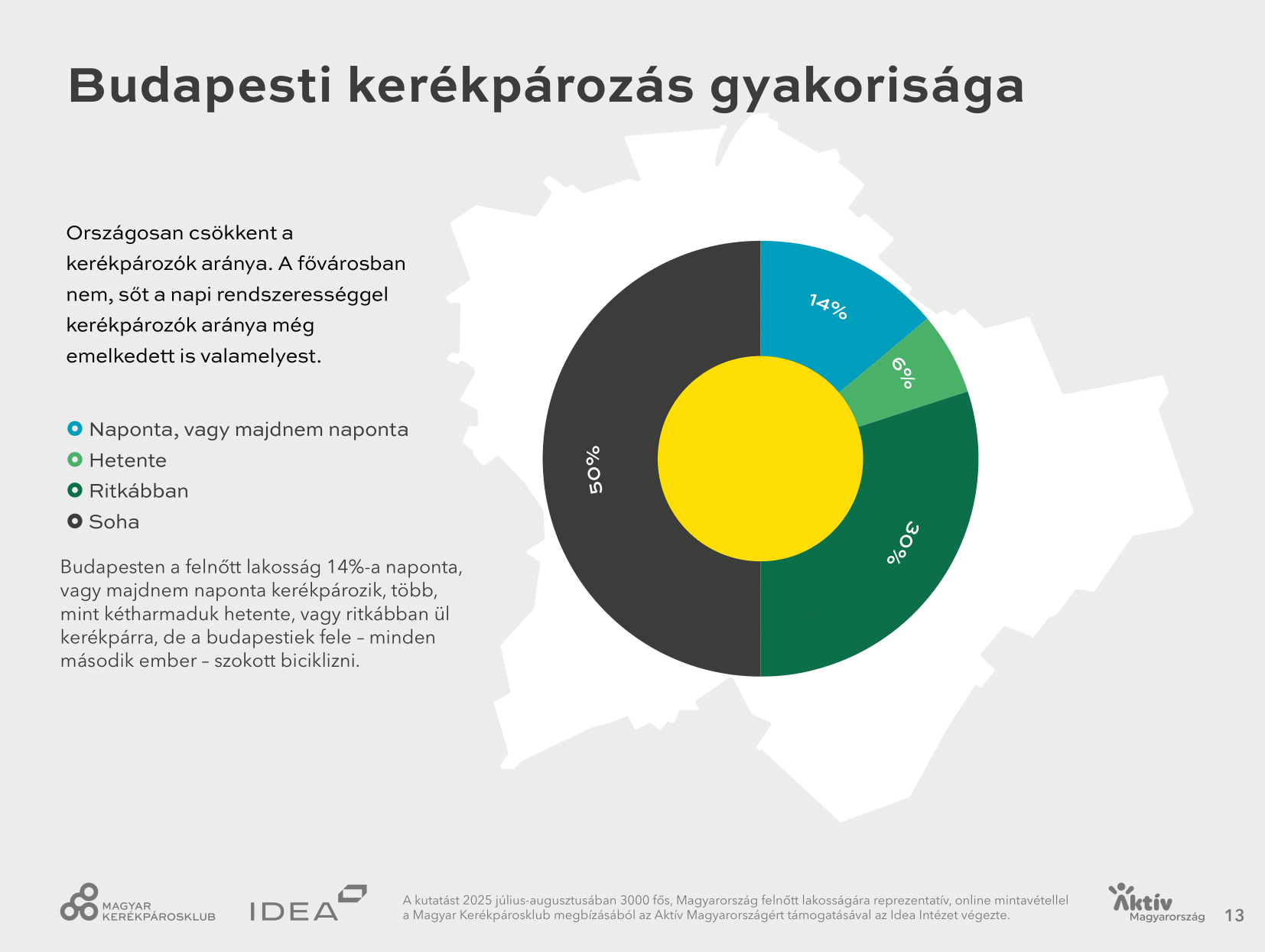 Országosan csökkent a kerékpározók aránya. A fővárosban nem, sőt a napi rendszerességgel kerékpározók aránya még emelkedett is valamelyest. Budapesten a felnőtt lakosság 14%-a naponta, vagy majdnem naponta kerékpározik, több, mint kétharmaduk hetente, vagy ritkábban ül kerékpárra, de a budapestiek fele – minden második ember – szokott biciklizni.