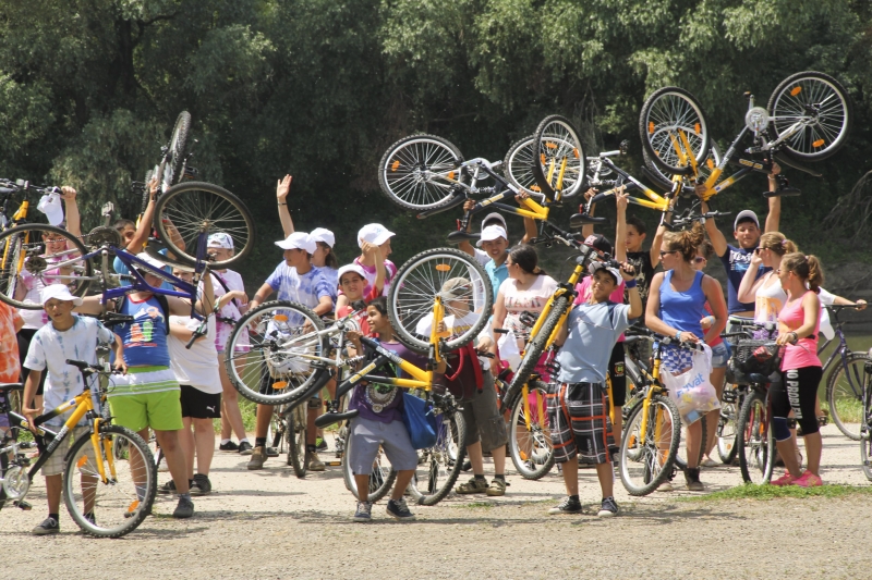A szalagvágást követően a Tisza-gáton vezető biciklitúra következett, melyre Kerékpárosklubos sapkákat kaptak a felsőtagozatos diákok.