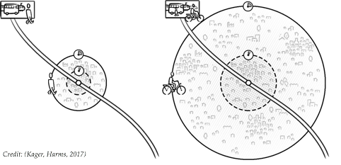 Mivel a kerékpár legalább háromszor gyorsabb a sietős gyaloglásnál, ugyanannyi idő alatt legalább 3-szor nagyobb távot lehet biciklivel megtenni. A vasútállomás gyűjtőterülete így legalább 9–10 szeresére nő (pi*r²). Annyival többen, annyival könnyebben érik el a vasútállomást, minél jobbak a kerékpározás feltételei.