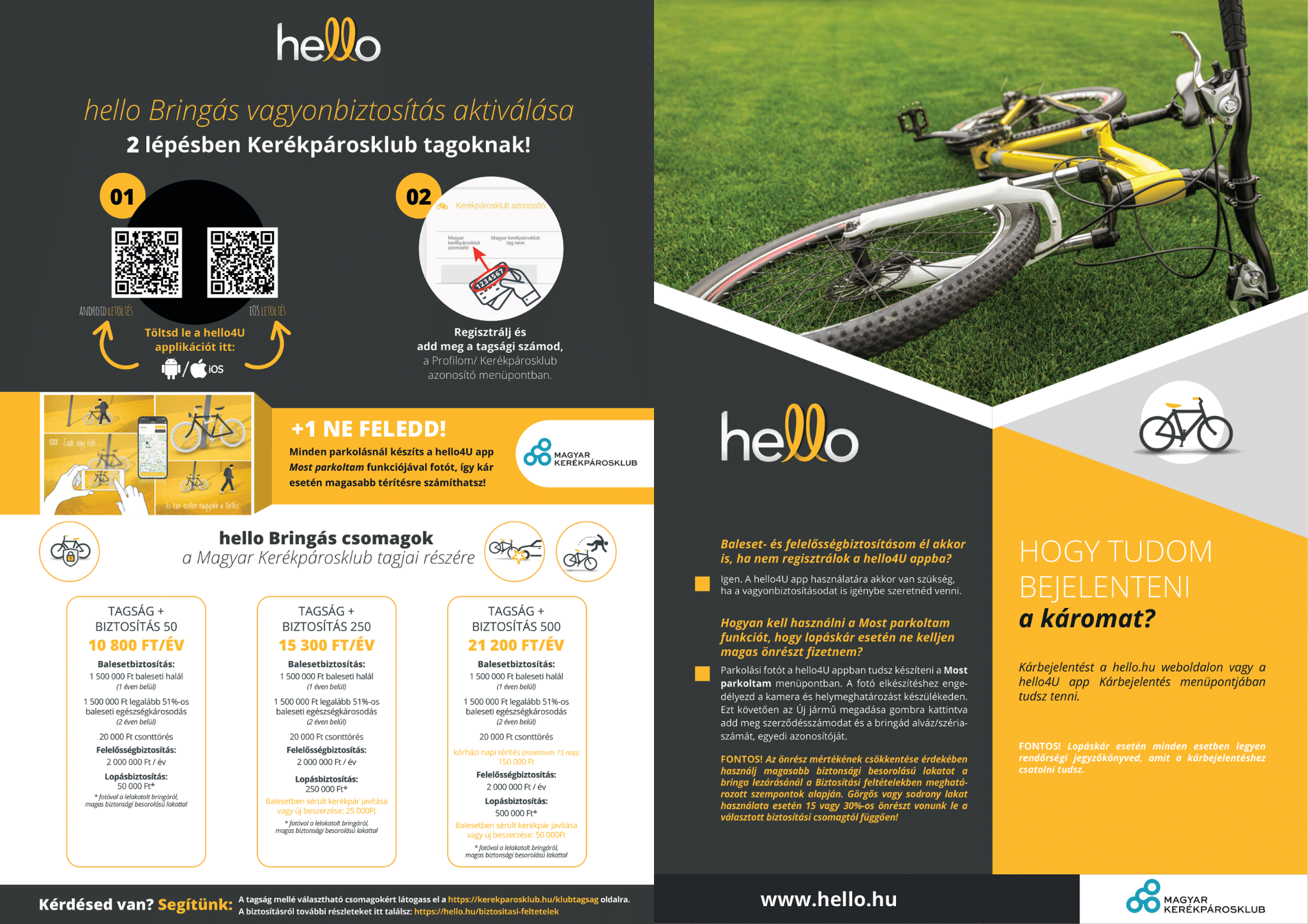 Kerékpárosklub tagok kedvező ajánlattal vehetik igénybe a hello Bringás biztosításait, emellett további szolgáltatások, kedvezmények járnak a tagsághoz, valamint a bringás fejlődésért végzett munkát támogatod vele.