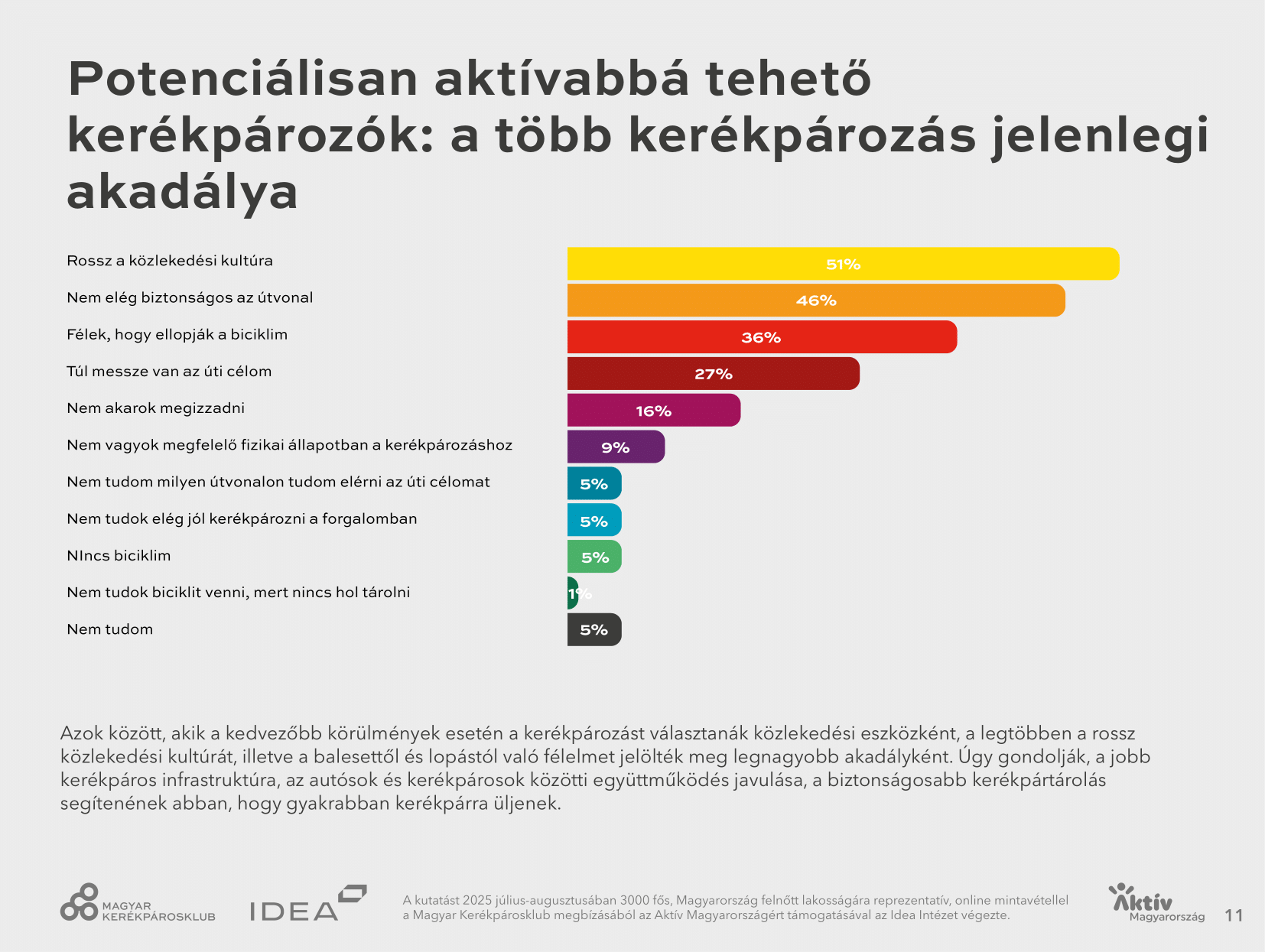 Azok között, akik a kedvezőbb körülmények esetén a kerékpározást választanák közlekedési eszközként, a legtöbben a rossz közlekedési kultúrát, illetve a balesettől és lopástól való félelmet jelölték meg legnagyobb akadályként. Úgy gondolják, a jobb kerékpáros infrastruktúra, az autósok és kerékpárosok közötti együttműködés javulása, a biztonságosabb kerékpártárolás segítenének abban, hogy gyakrabban kerékpárra üljenek.