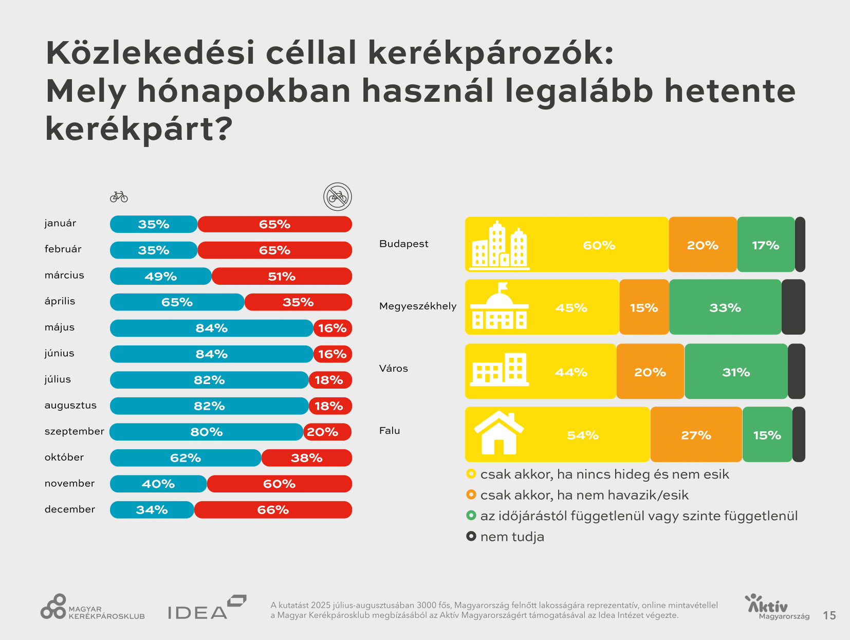 Az időjárás főleg azokat tántorítja el a tekeréstől, akik ritkábban kerékpároznak. Azok közül, akik közlekedési céllal használják a kerékpárt, egyharmaduk a leghidegebb hónapokban sem teszi le a biciklit, a mindennap vagy majdnem mindennap kerékpározók majdnem kétharmada teker a téli hónapokban.