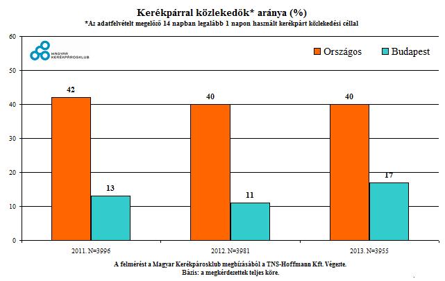 2010 tavaszától a Magyar Kerékpárosklub rendszeresen publikál országos reprezentatív adatokat a magyarországi kerékpárhasználat alakulásáról. Az adatfelvételeket a TNS-Hoffmann piackutató cég végzi ingyenesen, támogatva ezzel szervezetünket. A legfrissebb, 16. adatfelvételi hullámra 2014. május 12-16. között került sor. Az eredmények a kérdezés előtti 2 hétre (azaz a 2014. április 28. és 16. közötti időszakra) vonatkoznak.