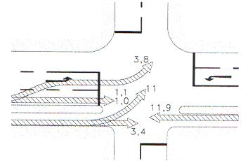 • A sebességkülönbség okozta veszély látszólag megszüntethető, ha a két járműtípust két külön útra tereljük. „Autók az autóúton, kerékpárok a kerékpárúton”. Ez elsősorban lakott területen kívül valósítható meg, ott, ahol a két út nem keresztezi egymást sűrűn. Mert egy olyan kereszteződésben például, mint amit az alábbi ábra mutat, a két jármű vezetője csak akkor észleli egymást, ha már össze is ütköztek.