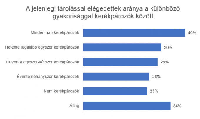 A jelenlegi tárolással a megkérdezettek harmada elégedett, ebből a szempontból az Óbudai lakótelep mintaterületnek választott része az átlagot reprezentálja. Az elégedettek táborát erősíti a családi házban élők nagy része (70%), de az átlagnál jelentősen magasabb a Pók utcai elégedettek aránya is (46%). Ez egyértelműen összefügg a tárolási lehetőségekkel, arányaiban itt vannak a legkevesebben rászorulva a kerékpárok lakásban vagy közös területen tárolására. Ezzel párhuzamosan az átlagnál jóval kevesebben elégedettek a Békásmegyeren élők. Ezen a területen, ahol a lakók 70%-a lakásában tárolja a kerékpárját, átlagosan csak minden hetedik megkérdezett elégedett a jelenlegi helyzettel.